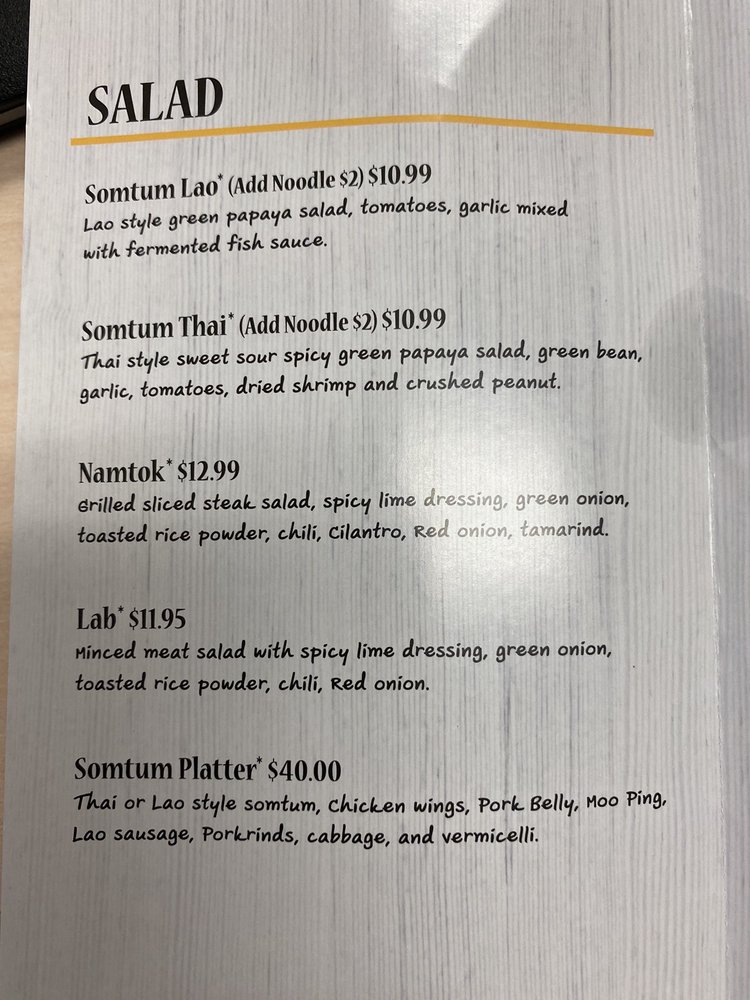 Somtum Thai - Thai style sweet sour spicy green papaya salad, green bean, garlic, tomatoes, dried shrimp, and crushed peanut.Somtum Lao- Lao-style green papaya salad, tomatoes, and garlic mixed with family recipe fermented fish sauce.