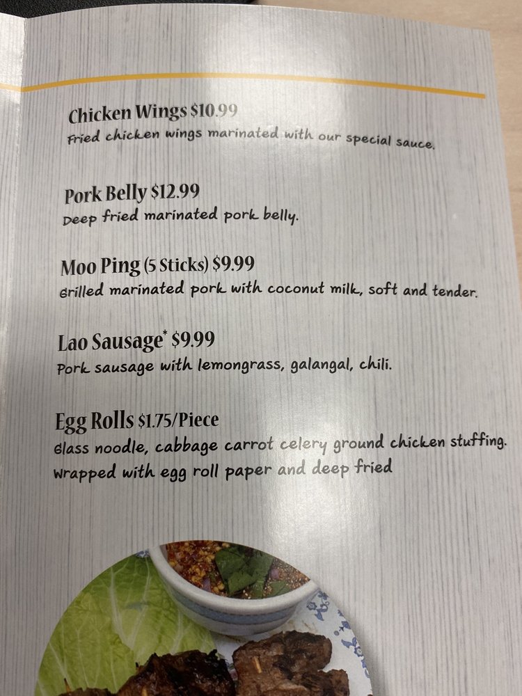 Thai or Lao style somtum, chicken wings, pork belly, moo ping, Lao sausage, pork rinds, cabbage, and vermicelli.