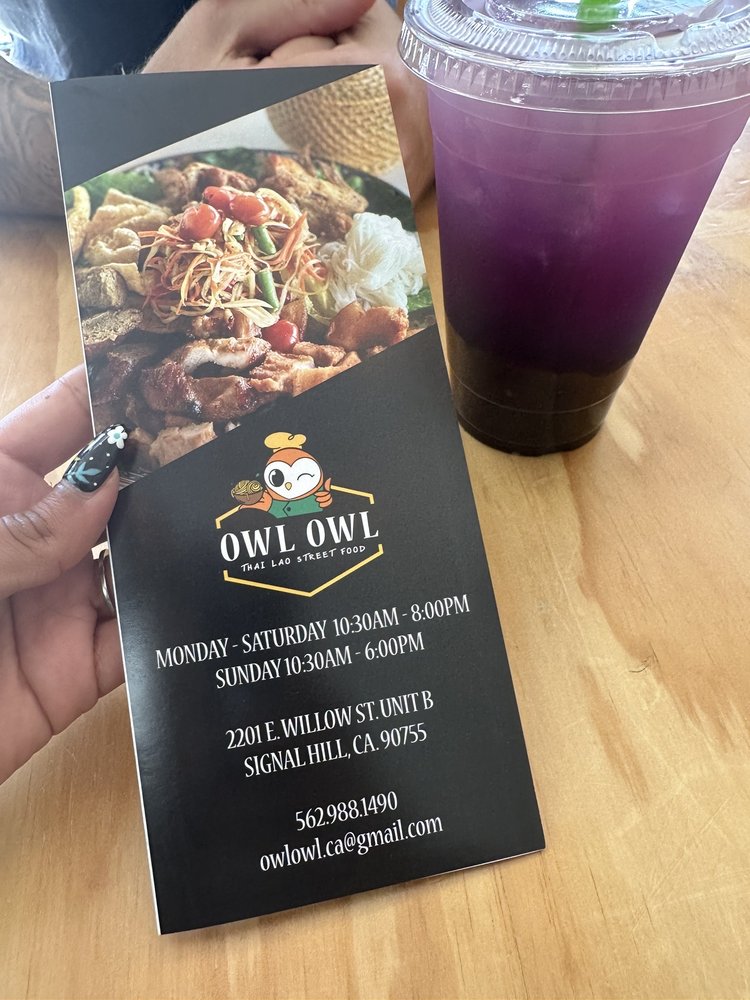 Introducing OWL OWL Thai Lao Street Food, a Laotian-Thai gem located in Signal Hill, CA. This casual eatery offers a diverse menu with vegan and vegetarian options, making it perfect for groups and families. The assortment of appetizers includes Egg Rolls, Chicken Wings, Moo Ping, Fried Pork Belly, Lao Sausage, Spring Rolls, and Fried Wonton. Each dish is crafted with unique flavors and traditional recipes, guaranteed to satisfy your cravings. To end your meal on a sweet note, indulge in Mango Sticky Rice or Nam Vaan dessert. With options for delivery, takeout, and catering, OWL OWL ensures a convenient dining experience. Add in their sustainable practices like compostable containers and plastic-free packaging, and you have a dining spot that not only delights your taste buds but also cares for the environment. Experience the savory and aromatic tastes of OWL OWL Thai Lao Street Food today!